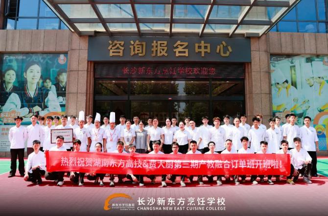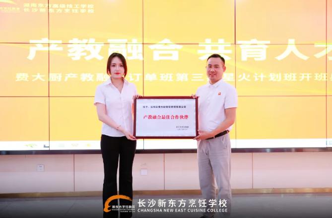 6月17日,湖南東方高級技工學校烹飪學院創就業指導中心與深圳費大廚餐飲管理有限公司攜手打造的“費大廚產教融合訂單班第三期星火計劃班”開班典禮隆重舉行。校企雙方領導、教師代表、第三期星火計劃班同學們以及在校百余名新生齊聚一堂,共同見證這一深化產教融合、賦能人才培養的重要時刻。此次合作標志著雙方在“人才共育、資源共享、發展共贏”的道路上邁出堅實一步,為餐飲行業注入新鮮血液,助力學子實現從校園到職場的無縫銜接。