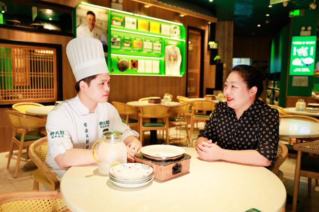清晨的陽光透過費(fèi)大廚金茂店的后廚玻璃窗,落在滋滋作響的炒鍋里。23歲的陽超正手持鍋鏟,手腕輕翻間,辣椒與肉片在高溫中碰撞出誘人的香氣——這是他在費(fèi)大廚的第三個年頭,如今已是門店副廚師長的他,見到湖南東方高級技工學(xué)校烹飪學(xué)院就業(yè)辦的老師們,眼里瞬間亮起了熟悉的光。
